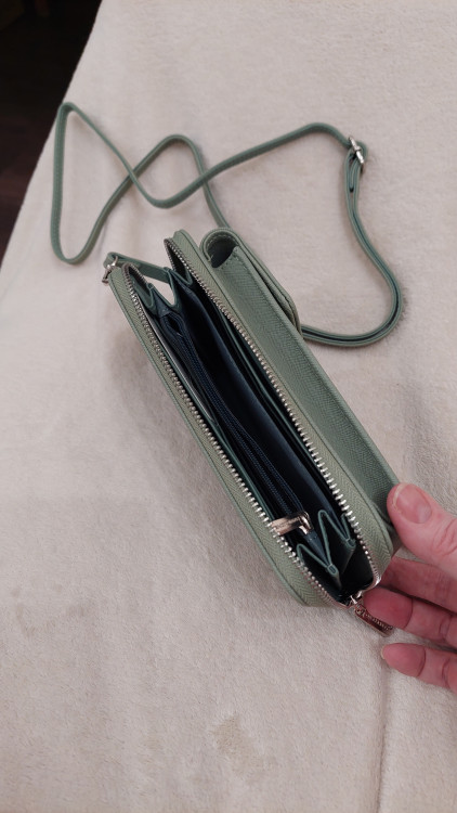 Отличная сумочка для телефона с отделениями для денег. Цвет светло-зеленый просто отличный для лета. Качество хорошее. Покупкой довольна.